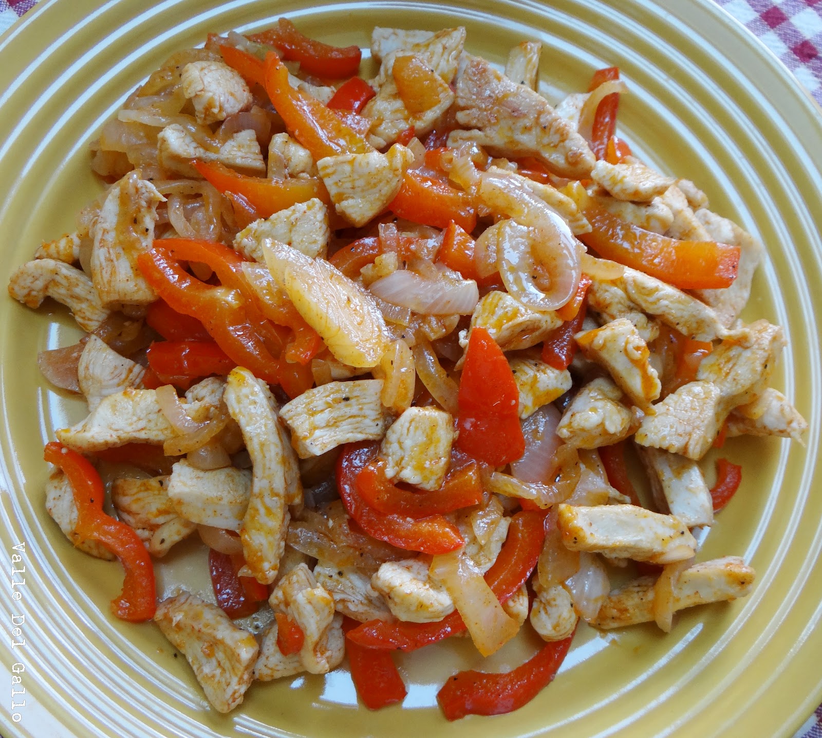En un sarten con teflon, poner aceite vegetal, luego agregar, el ajo picado, el pimenton, picado y la cebolla picada fina, dorar todo hasta que la cebolla se vea transparente, agregar la sal, paprika y pimienta, y al final agregar el pollo cortado en tiritas, dejar que el pollo se cocine, pero que no se reseque.
