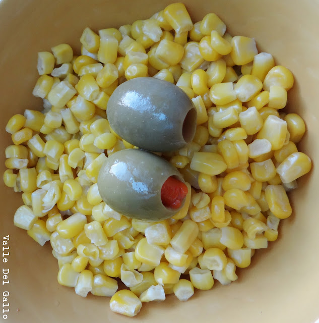 Cocer el Choclo, picar las Aceitunas, moler la Palta y cortar el tomate en pedacitos, mezclarlo con la palta, agregar un poco de aceite de oliva y sal. Rallar un poco de queso, colocar cada cosa en un pocillo, decorado con las aceitunas espanolas, rellenas con pimenton y a Comer!!!!!