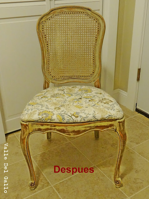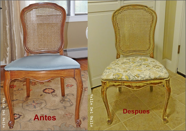 Hola hace mucho tiempo que queria encontrar estas sillas antiguas, con ese enrrejado en la parte trasera, la verdad es que ni siquiera se como se llama el modelo de silla, pero desde siempre me gusto ese estilo, hasta que la encontre en una tienda de antiguedades, estaban en buenas condiciones, y justo habia un par, asi que me decidi y las compre, por supuesto, en mi mente las imagine de otra manera, con nueva pintura y nuevo tapiz, ahora se ven muy lindas. Aqui ocupe la tecnica de Chalk Paint, y luego del lijado correspondiente, le aplique una mano de glaze Cafe Oscuro para darle este toque como antiguo.