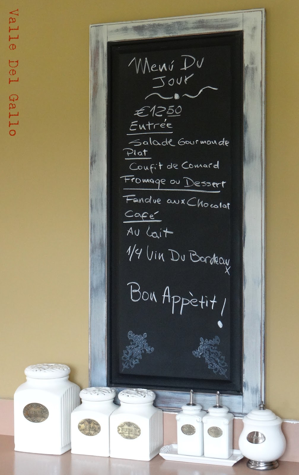 luego para los bordes haces otra mezcla de chalk paint con el color que tu quieras, la aplicas y esperas que seque, lijas y si quieres aplicas un wash o un glaze para realzar el color de la pintura. yo ocupe un glaze primero color cafe oscuro y luego y wash blanco y asi quedo terminada, ahora se ve muy linda en la pared de la cocina.