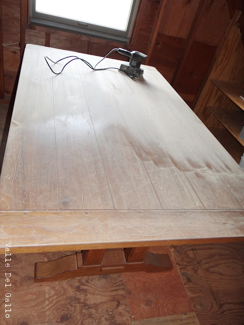 Aqui la mitad de la mesa esta lijada y la otra mitad y las patas tienen el color original, ese color como anaranjado, que no me gusta.