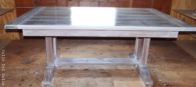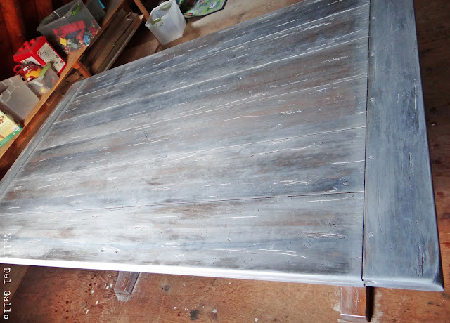 Aqui se puede ver que una vez seca, la mesa tomo ese color gris claro casi blanco y las manchas del antiguo tinte que se ven abajo, le dan ese aspecto como rustico que yo queria, pero quise aclararla un poco mas, asi que una vez que el tinte seco bien, aplique White Wash, de Minwax, con una brocha de espuma.